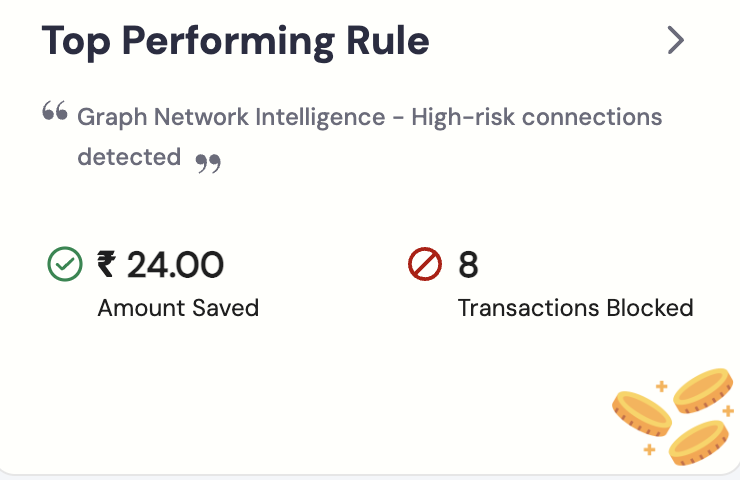 Track the effectiveness of your RiskShield rules in preventing fraud. This section showcases your Top Performing Rule, highlighting the specific rule name along with the total Amount Saved and the number of Transactions Blocked. For each rule, you can monitor:- Rule Name: The name of the fraud prevention rule.