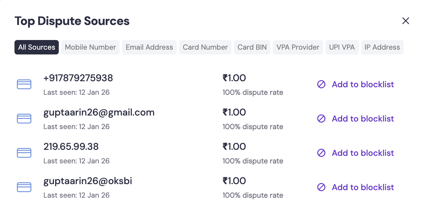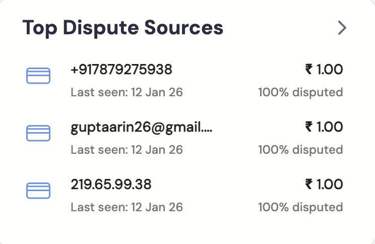 This section lists the most frequent origins of disputes so you can identify repeat offenders and take preventive action. RiskShield tracks disputes across multiple source types to help you pinpoint patterns:-