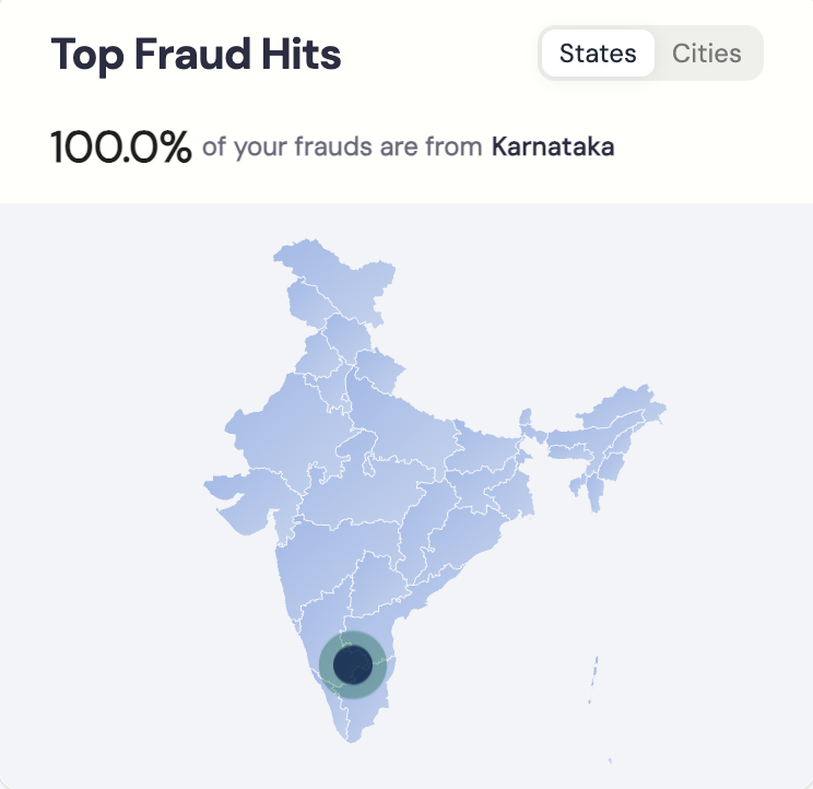 Monitor where fraud originates to identify the top states and cities contributing to fraud volume. You can toggle between States and Cities to view specific fraud sources. For example, 100% of your frauds are from Karnataka. These insights help you identify geographical risk clusters and take actions such as tightening rules or reviewing suspicious locations.