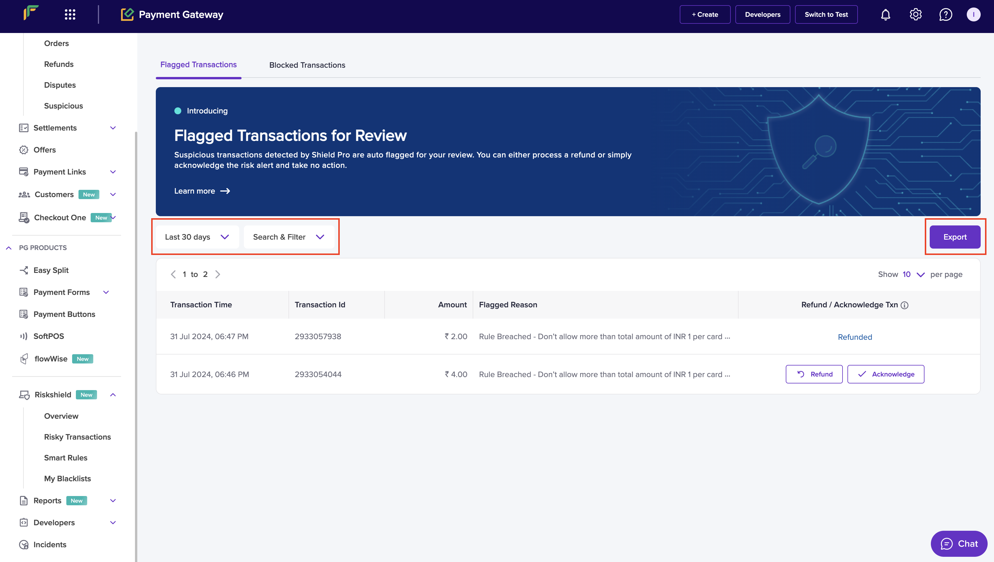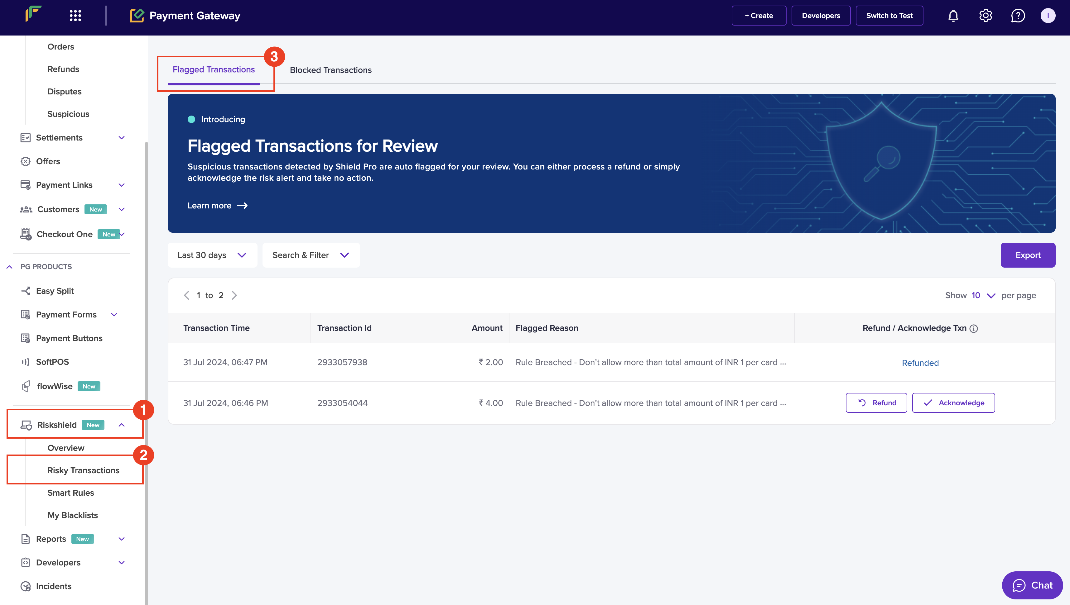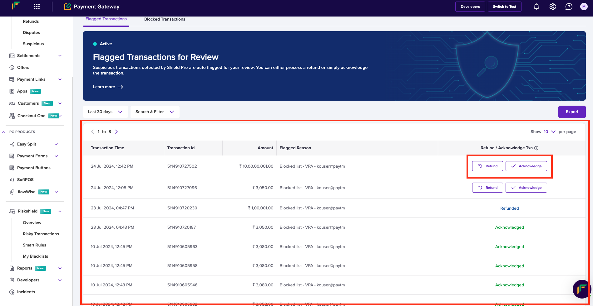 - Go to **Payment Gateway > Riskshield > Risky Transactions > Flagged Transactions.