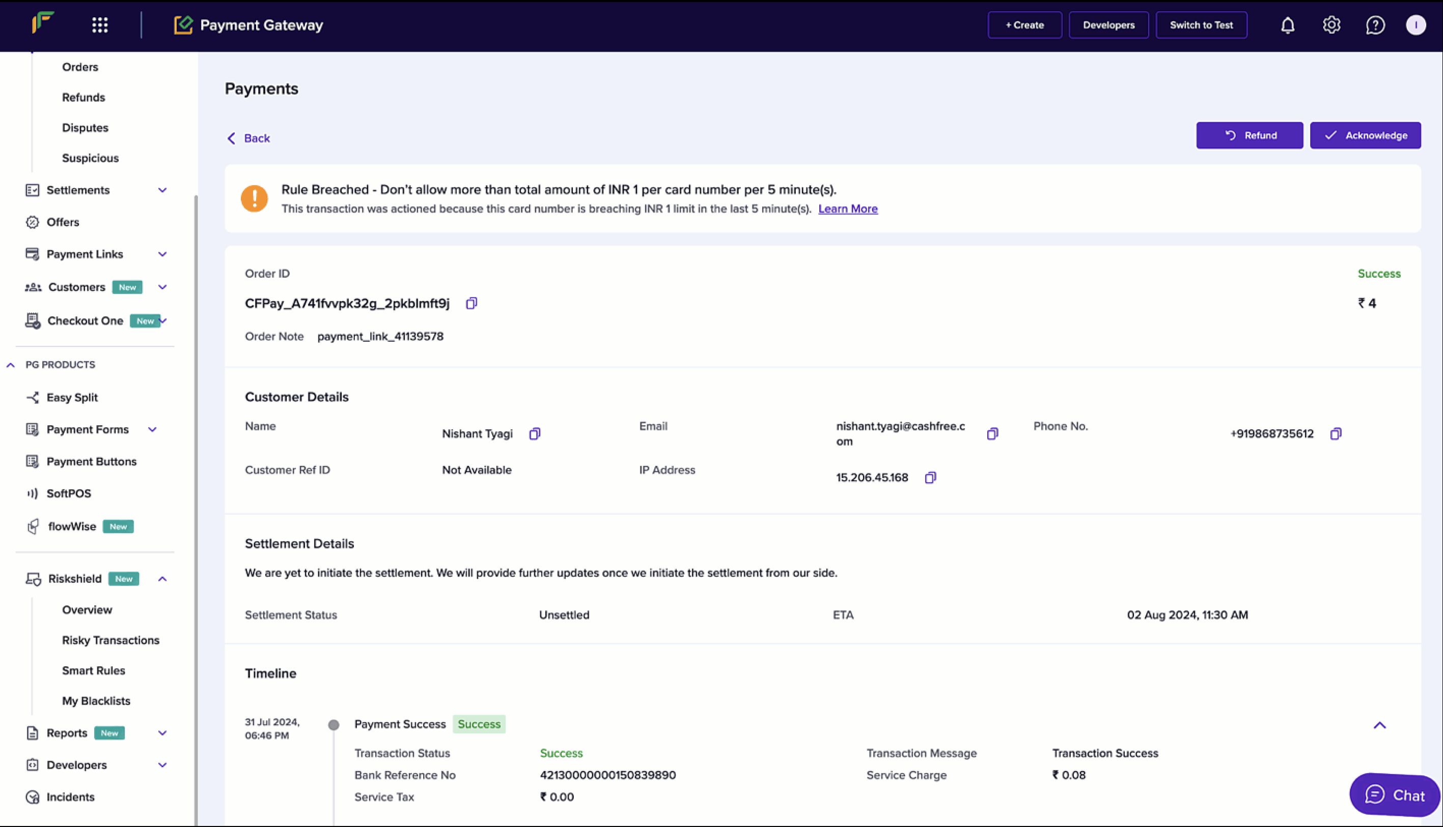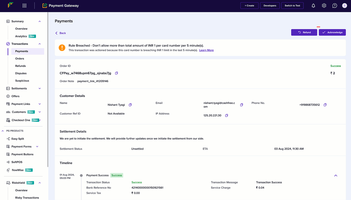 You can choose to refund the flagged transactions by following the instructions below:- From the Flagged Transactions screen, you can click Refund to proceed with the process or select the flagged transaction to view it in detail.