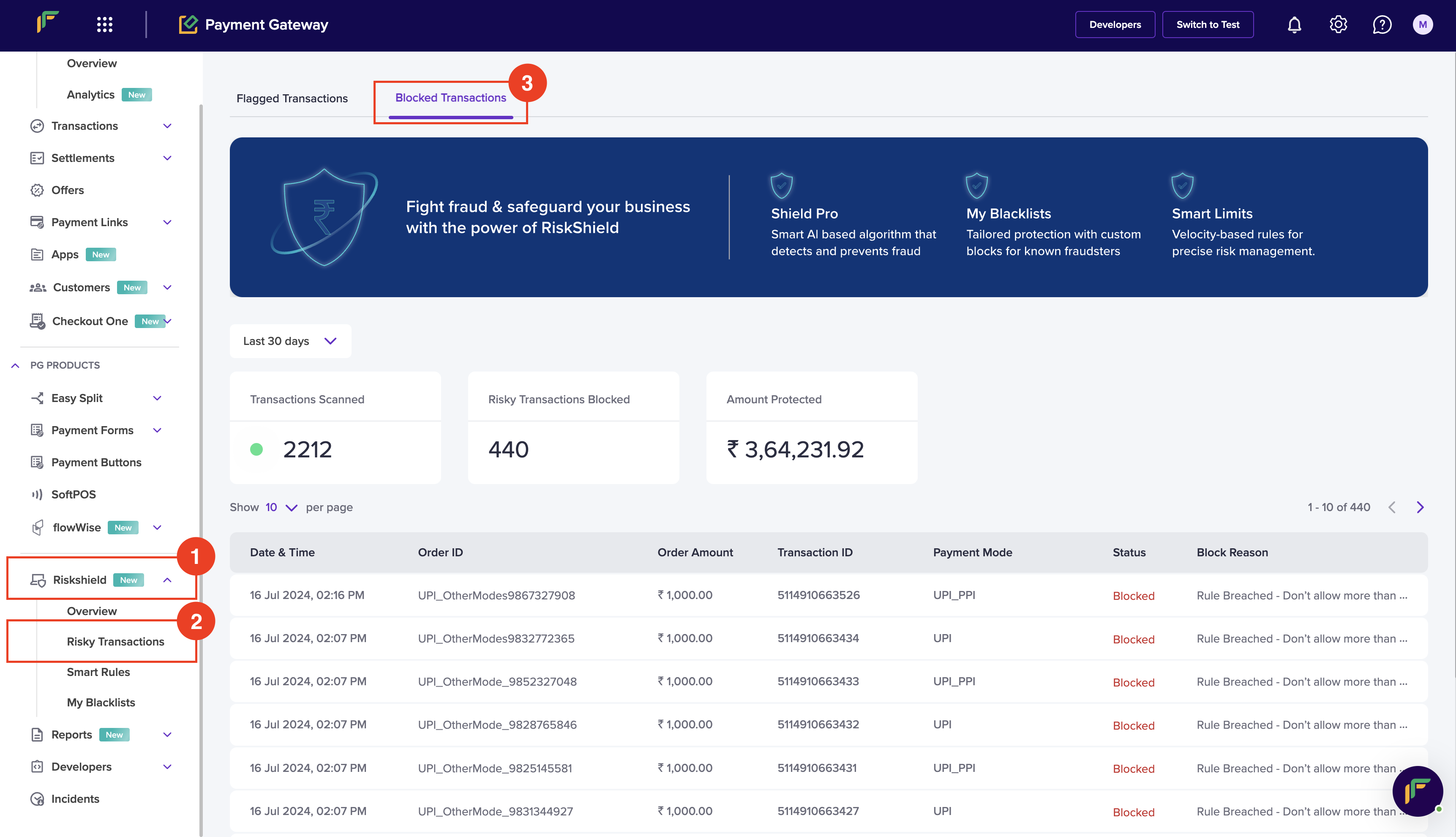 You can view the transactions that we prevent or restrict from being processed. For the transactions under the recommended rule(s), you chose to block appear here. Follow the instructions below to view the blocked transactions:- Navigate to Riskshield > Risky Transactions > Blocked Transactions.