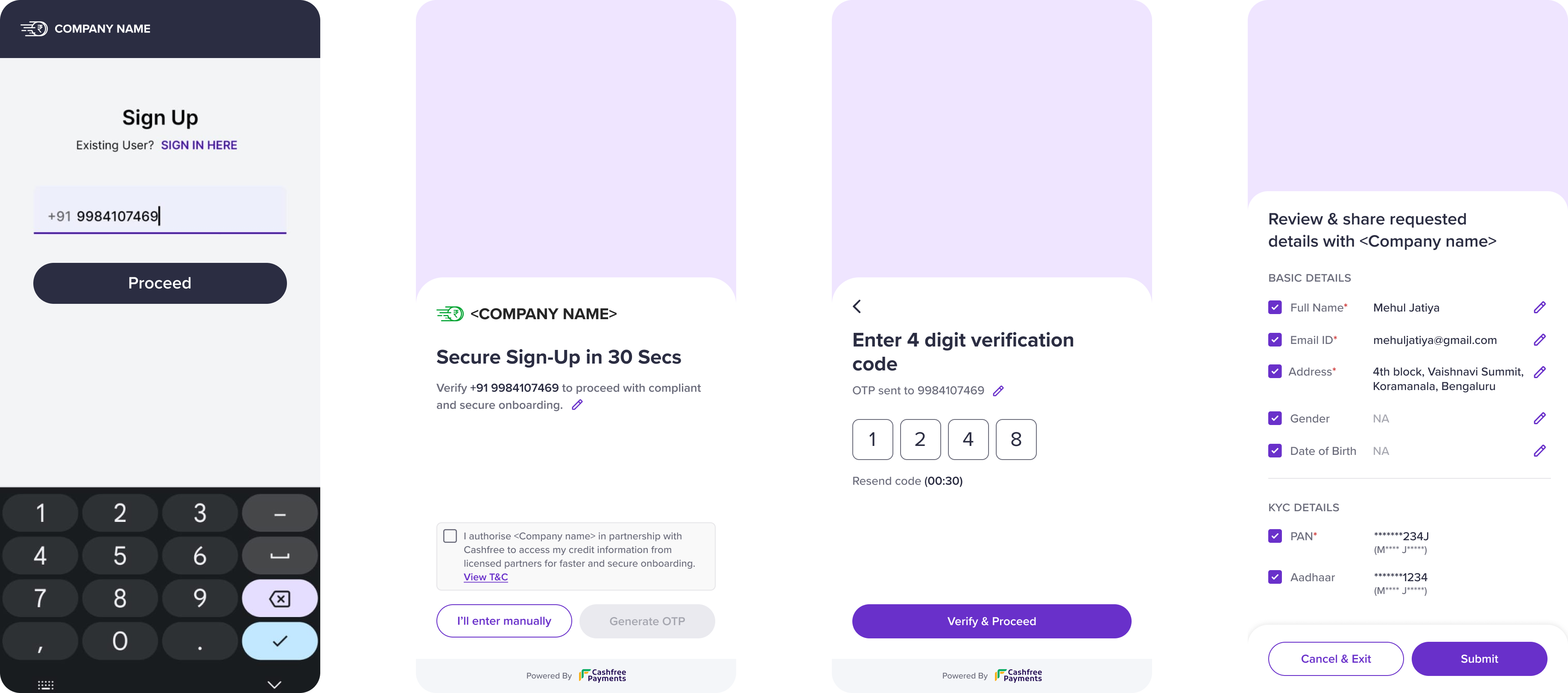 Use the Data Availability API to check if user data is available for the given mobile number.This step is mandatory. Based on availability, either display Cashfree’s consent screen or continue with the regular onboarding flow.