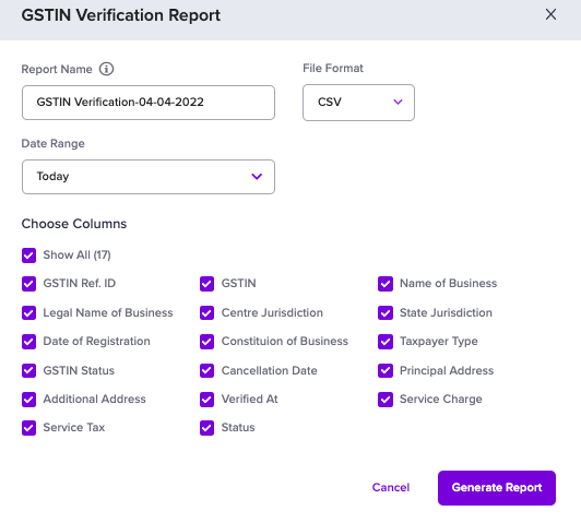 - Go to the Secure ID Dashboard > Reports > select GSTIN Verification in the Report Type field.