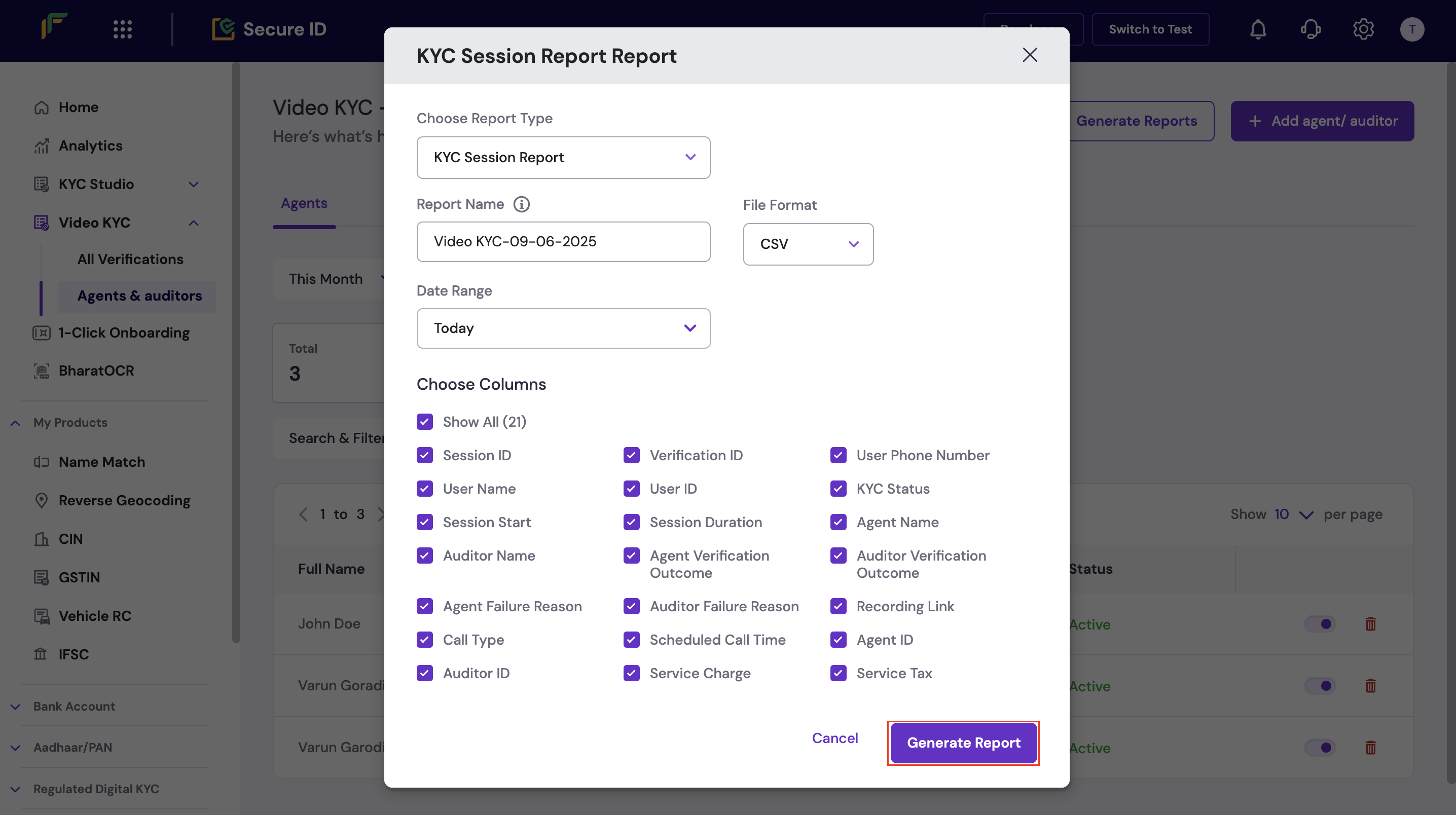 - Select Generate Reports. This opens the KYC Session Report modal.